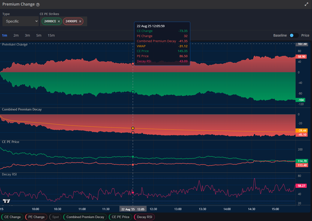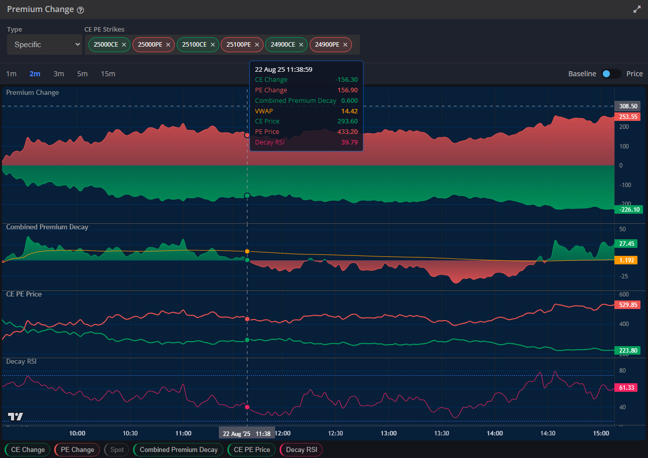 9:15 AM Baseline: All premium changes are calculated relative to the opening premium at 9:15 AM, providing a consistent reference point for intraday analysis. This baseline helps traders understand how much premium has been gained or lost since market open, accounting for overnight changes and early morning volatility.