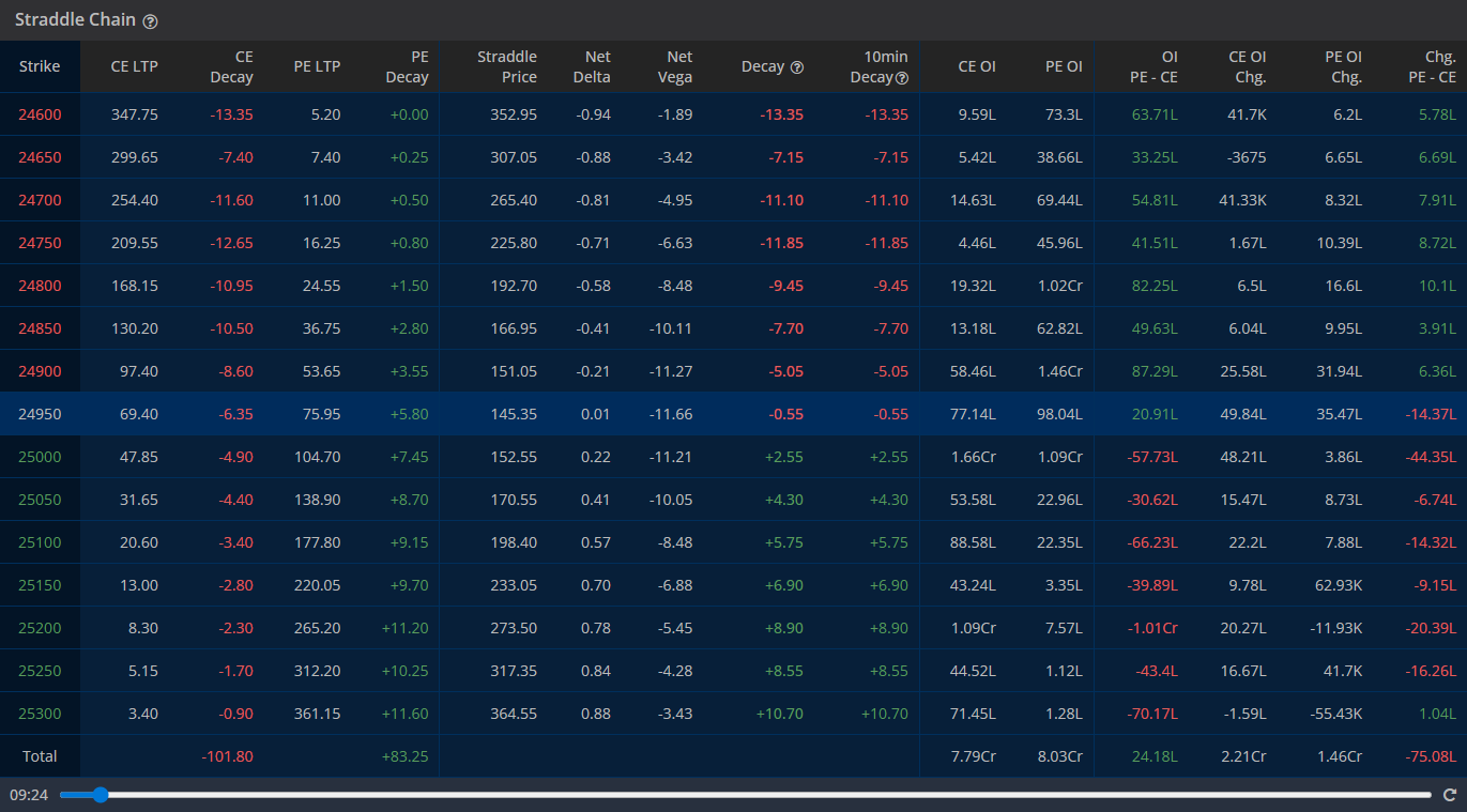 | 24900-25000 | -5.17 | Moderate (ATM Zone) | Balanced decay with maximum optionality |